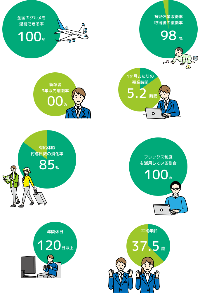 ・産休・育休取得実績あり。復帰後も役職はそのまま・男性の育休取得実績も多数・お子さんの体調不良などにも柔軟対応・会社が導入している保養所へ格安で利用可能・有名テーマパークの割引制度など